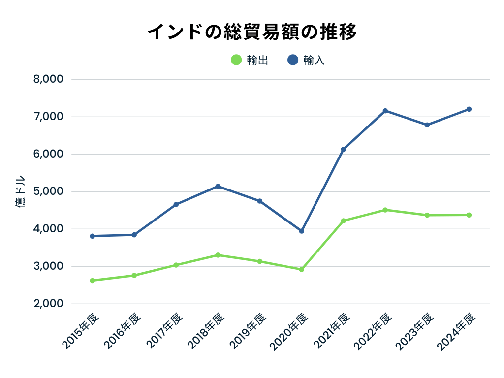 さらに人口は14億人を超え、中国を抜いて世界最多となりました。この巨大な人口を背景に、インドは労働力が豊富な生産拠点や成長著しい消費市場として注目されています。以下の輸入貿易額の推移からもインドの消費市場の拡大が伺えます。