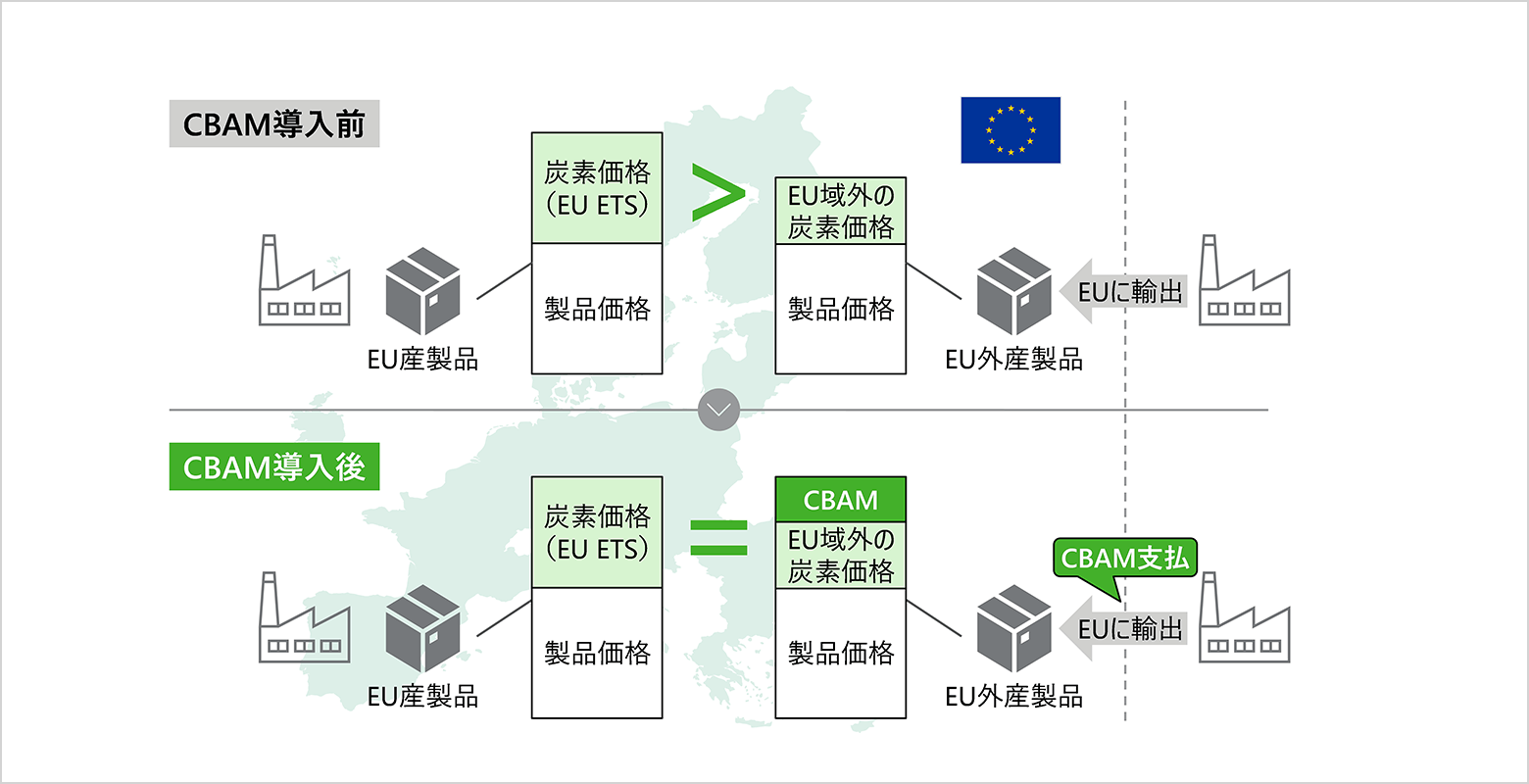 つまりCBAMは、EU域内外を問わず、同レベルの炭素価格を負担させることを目的とした制度です。その結果、地域ごとの炭素価格の違いによって生じる不公平感の是正が期待されています。