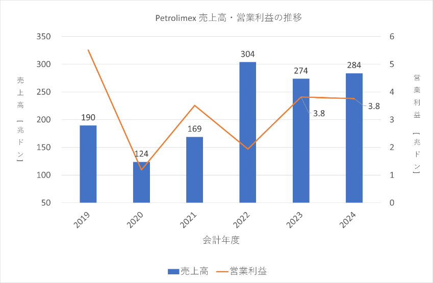Petrolimexの経営状況として、直近6年間の売上高と営業利益の推移を紹介します。