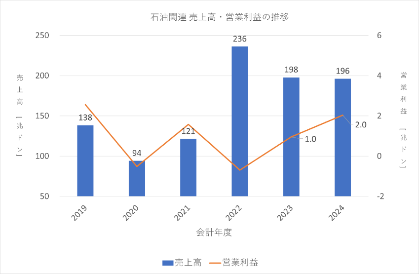 石油関連事業は原油やガソリン、石油の生産、販売をしている事業です。同事業の売上高と営業利益の推移は次のとおりです。