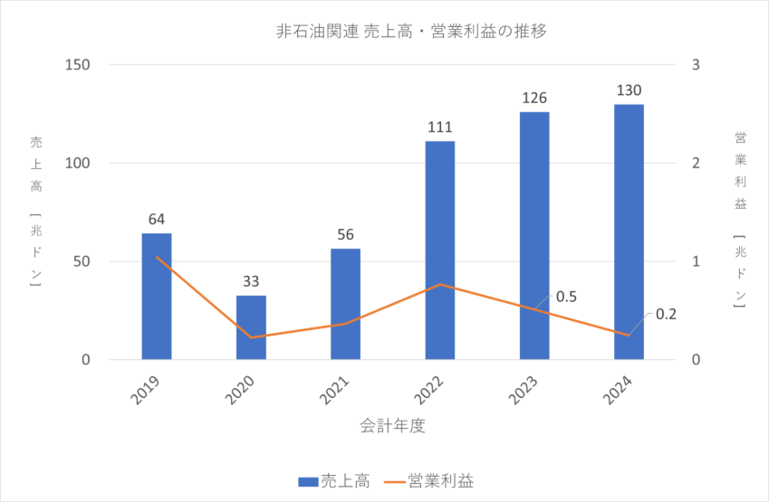 非石油関連事業は、保険や金融、建設などのエネルギー関連以外の事業です。売上高と営業利益の推移は以下のとおりです。