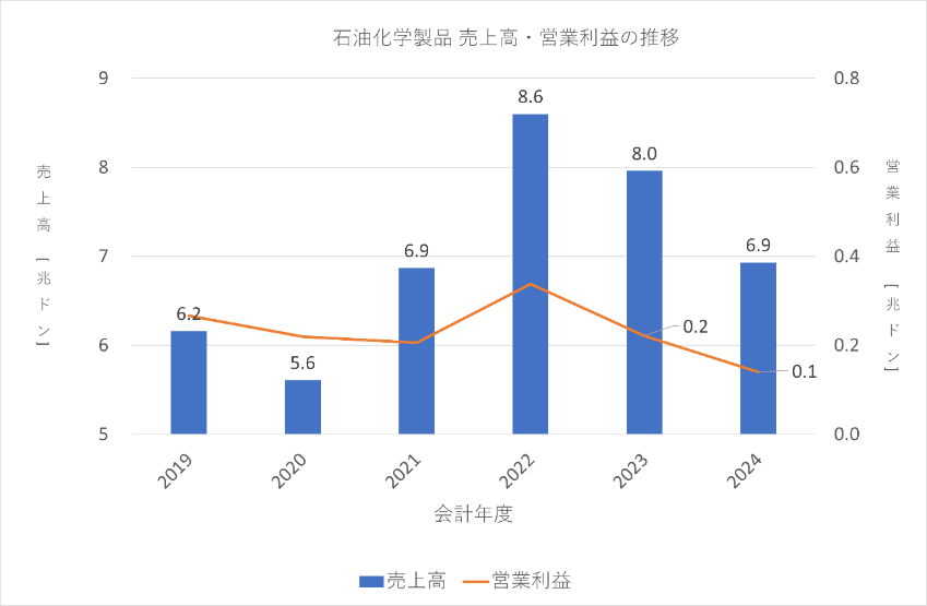 石油化学製品事業は、潤滑油を中心とした石油化学製品の販売を行っている事業です。売上高と営業利益の推移は以下のとおりです。