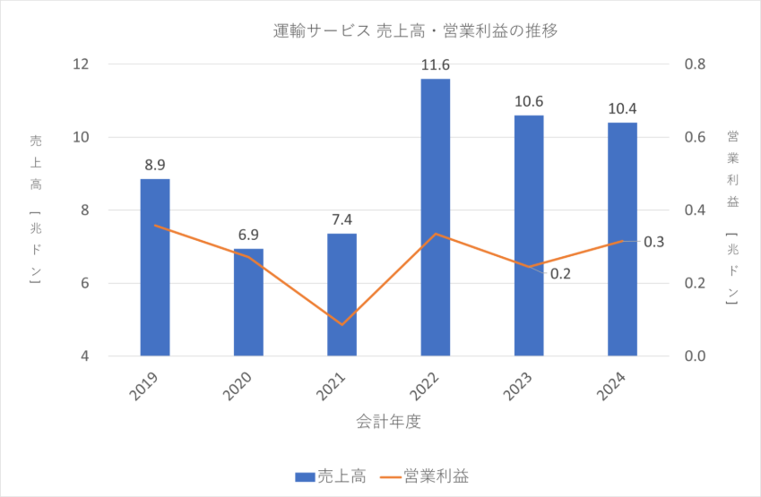 運輸サービス事業は、主に石油の海上輸送サービスを提供している事業です。売上高と営業利益の推移は以下のとおりです。